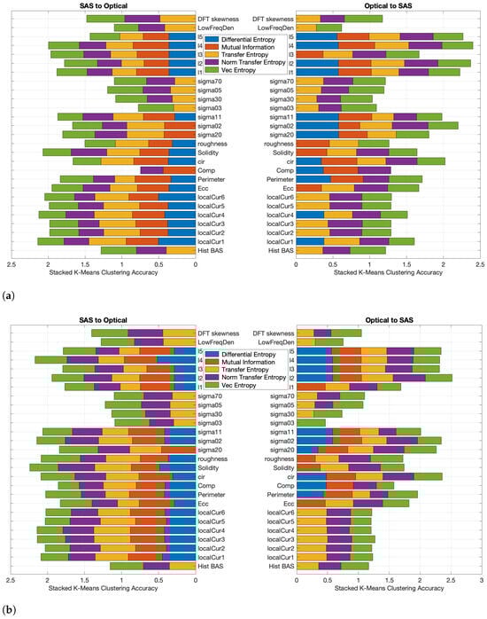 Stacked K-Means clustering accuracies of each entropy type, in different colors (X-axis), as tested with each each of the 27 features (Y-axis). The accuracy here refers to the accuracy of the resulting clusters at splitting the positive and negative image pairs (their entropy comparison values). (a) K-Means accuracies for entropy measures by feature with SAS highlight only. (b) K-Means accuracies for entropy measures by feature with SAS shadow only.