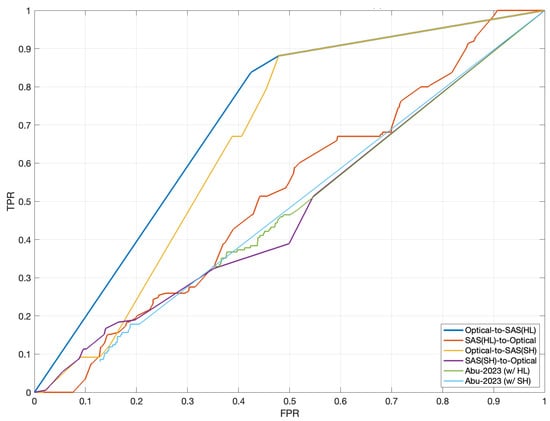 For each selected feature, we now examine the results of the entropy matching procedure. The results are measured using the receiver operating characteristics (ROC) curve to observe the trade-off between the detection rate and the false alarm rate. Detection is defined here as the correct assignment of a positive match, while a false alarm refers to the case of a positive decision on a non-similar object pair. The results are shown in Figure 10, and are compared to the work of [17] as a benchmark. We report that the highest clustering accuracy was achieved with differential entropy. We compute the ROC for this entropy measure in all possible directions, i.e., from optical to SAS HL and to SAS SH and from SAS HL and SAS SH to optical.