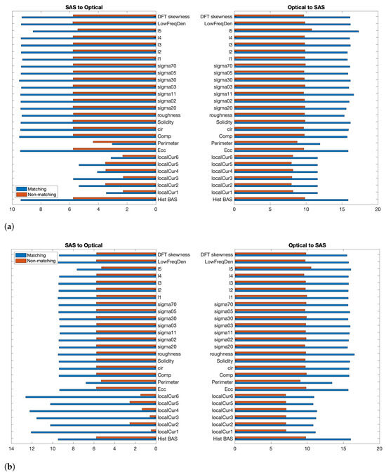 To quantify how well each feature’s entropy measure separates between a positive and a negative match, we use the K-Means Clustering algorithm. It aims to divide a number of observations into K clusters. In our case, , and we assume that the feature whose entropy measures are most correctly clustered should be used for identifying matches. This choice of is due to the fact that here we cluster the entropy values comparing optical–SAS image pairs into either “matching” or “non-matching”, which is a binary task. For the SAS optical matching case, the accuracy of the K-Means clustering is used to indicate for each direction (from SAS to optical and from optical to SAS), for each entropy measure, and for each selected feature descriptor whether the positive and negative cases are well observed and distinguished from each other.