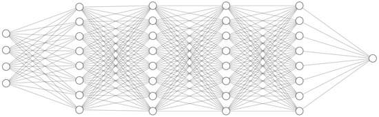 Main MLP model architecture that we use for COT estimation. The input layer is shown on the left (4 nodes are shown for the input instead of all 12, to avoid visual clutter). This is followed by four hidden layers (8 nodes shown for each, instead of 64). Finally, the output layer on the right produces the COT estimate . Each of the five layers is of the form for , with and . Here, and respectively represent the weight matrix and bias vector for the k:th layer, and these parameters are calibrated through the training process (see Section 3.1). Note that we use an MLP, rather than, e.g., a convolutional architecture, since the data points are independent from each other in our synthetic dataset.