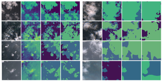 Eight additional qualitative examples on the KappaZeta test set (examples are shown in the same format on the left and right side of this figure). In each example, columns 1 and 4 are the same as in Figure 3, while column 2 shows pixel-level cloud-type predictions based on thresholding the COTs of an MLP ensemble approach that was trained only on our synthetic data. Column 3 is the same as column 2, but the MLPs were refined on KappaZeta training data. Fine-tuning sometimes yields better results (e.g., top two rows on the left). In many cases, the results are, however, very similar before and after fine-tuning (e.g., third row on the left and right side), and sometimes results worsen after fine-tuning (e.g., fourth row on the left).