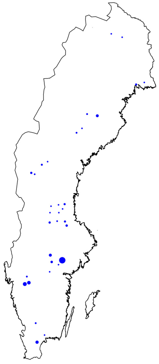Locations in Sweden of the annotated imagery provided by the SFA. Larger dots indicate a higher density of images in the associated region.