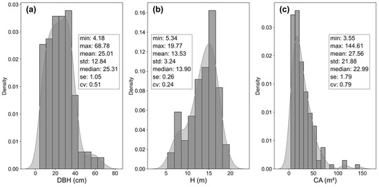 Raw TLS point clouds were filtered and exported in SCENE software (version 6.2.4.30, FARO, Lake Mary, FL, USA). GlobalMatch [57] was employed to carry out point cloud registration at the plot level by calculating a 4 by 4 transformation matrix. Point cloud merging and cropping was conducted with CloudCompare software (version 2.13.beta). The Computree platform (version 5.0, ONF, Paris, France) and the plug-in SimpleForest [58] were employed for individual tree point cloud segmentation. TreeQSM (version 2.4.1, Raumonen et al. [42]) was further applied for quantitative structure modeling and structural metrics calculation. In total, 150 trees within 7 plots were processed and served as ground truth data. Figure 2 shows the distributions and statistics of representative structural metrics from TLS point clouds, including diameter at breast height (DBH), tree height (H), and crown area (CA).