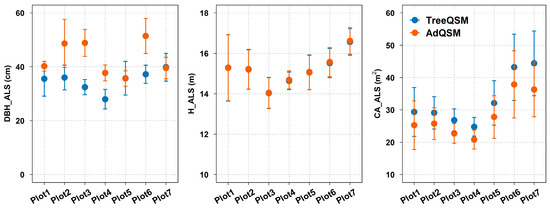Plot-level statistical descriptions of forest structural metrics, derived from ALS data using TreeQSM and AdQSM, are presented in Figure 5. For TreeQSM results across the seven plots, the mean values of DBH, H, and CA varied from 27.97 to 39.84 cm, 14.04 to 16.56 m, and 24.78 to 44.40 m2, respectively. Concurrently, the standard errors (SEs) for DBH, H, and CA ranged from 2.80 to 6.41, 0.43 to 1.63, and 2.87 to 10.24, respectively. In comparison, the results obtained from AdQSM had the mean values of DBH, H, and CA ranging from 35.65 to 51.43 cm, 14.03 to 16.62 m, and 20.82 to 37.88 m2, respectively. The corresponding SEs for DBH, H, and CA varied from 1.79 to 8.91, 0.44 to 1.64, and 2.89 to 10.4, respectively. Furthermore, large differences were observed in DBH in the specific plots (plot 5 and plot 7) and CA (all plots) while they were nearly identical in H (all plots).