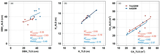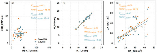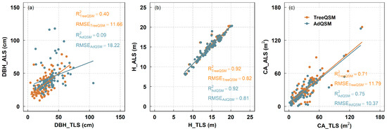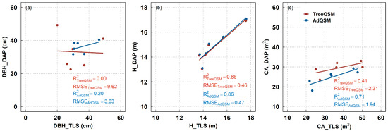 At the individual tree level, poor relationships were also found for DBH, regardless of the use of TreeQSM and AdQSM, as indicated by an R2 lower than 0.03 and RMSE higher than 13.49 (Figure 12a). DAP is closely related to TLS for H, with an R2 of 0.89 (RMSE: 0.94) for TreeQSM and 0.90 (RMSE: 0.88) for AdQSM (Figure 12b). In addition, DAP displayed a moderate relationship with TLS (Figure 12c), and the TreeQSM had a slightly higher R2 (0.50 vs. 0.43) and lower RMSE (11.20 vs. 11.80) for the CA when compared with AdQSM.