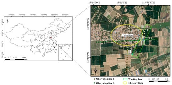 In this study, a coal mine working face in Guotun is selected as the case example, which is situated in Shandong Province, China. The Guotun coal mine is about 13 km wide and 14 km long, with a total area of approximately 180 km2, and with an altitude between +38 and +47 m. It is noted that the study area is adjacent to the Yellow River floodplain with lots of rainfall in summer, and the areas are mainly covered by surface vegetation, farmlands, and houses. The ground subsidence can lead to the serious collapse of farmlands, and roads as well as severe damage to houses and other infrastructures. In addition, mined-out areas may become ponds if the subsidence basin areas are influenced by heavy precipitation, which would seriously affect the residents’ lives and safety.