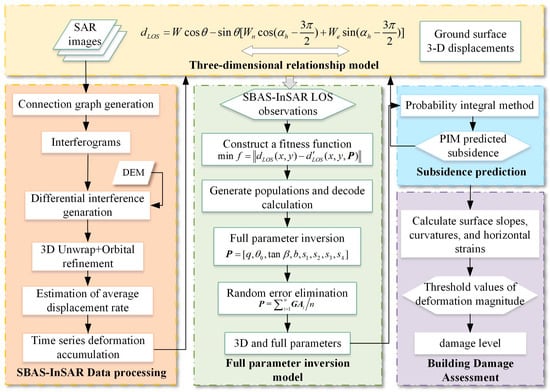 Therefore, the purpose of this study is to provide a comprehensive and refined parameter inversion and deformation prediction solution for the assessment of building damage in mining areas. To achieve this, we proposed a three-dimensional and full parameter inversion (TDFPI) model. Specifically, we first analyzed the 3D relationships between PIM principles and the high-density InSAR LOS observations, and then proposed a 3D data-driven genetic algorithm with random error elimination (GAREE) by spatial clustering to obtain the three-dimensional and full parameters of PIM as well as the goaf subsidence information. Furthermore, the accuracy of the proposed method was verified by result comparisons by taking a coal mine working face in Guotun as the case study. The building damage was also evaluated and assessed, which further validated the reliability and accuracy of the proposed TDFPI model.