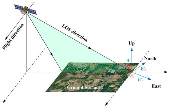 With the given study area, the SBAS-InSAR technique assumes that N + 1 SAR images (with the corresponding time series t0, t1, …, tn) are acquired by radar satellites, and the main image is selected with the other N images registering to the image space of the main image [21,47]. The accumulated surface deformation for each SAR image against the first SAR image can be obtained based on the SAR data process [19]. However, InSAR techniques only acquire the LOS displacement, which is the contribution of the real 3D surface displacement from three directions (west–east of We, north–south of Wn, and vertical directions of W), respectively [28], as is shown in Figure 3. The 3D relationship model can be described as