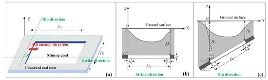 where is the maximum subsidence value, with the specific descriptions for the variables being illustrated in Table 1. To further derive the practical meaning of these parameters, we plot a diagram for coal mining excavation of a working face with the 3D view, and the 2D profiles along the strike direction and dip direction for the coal mine working face, as shown in Figure 4.