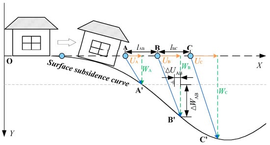 Having predicted the goaf subsidence based on the proposed TDFPI model, now we can assess the building damage inside the study area. In general, mining-induced subsidence is highly non-linear and belongs to non-uniform displacement, which will seriously affect the building structure. As the selected working face is beneath the farmlands and close to Chelou village, a great number of houses in Chelou village are distributed around the coal mining area and are affected by underground mining excavation. The commonly used indicators for the classification of mining-induced structural damage to buildings mainly consists of surface slopes, curvatures, and horizontal strains [22,39,48]. As illustrated in Figure 5, with the impact of ground subsidence, the surface points A, B, and C moved to the new location, denoted as points A′, B′ and C′. Denote the vertical and horizontal displacement of points A, B, and C as and , respectively. The surface slope i refers to the ratio of the subsidence value between two adjacent points to their horizontal distance, reflecting the slope of the subsidence basin in a certain direction. Curvature K denotes the ratio between the difference in inclination of two adjacent line segments and the horizontal distance from the midpoint, representing the curvature of the subsidence curve for the surface control points. Horizontal strains represent the ratio between the difference in horizontal displacement of two adjacent points and their horizontal distance, reflecting the difference in horizontal movement per unit length. Here, we take points A and B as examples with their horizontal distance denoted as . Therefore, the respective mathematical expressions for surface slopes between points A and B, curvatures for points A, B, and C, and horizontal strains for points A and B are described as follows: