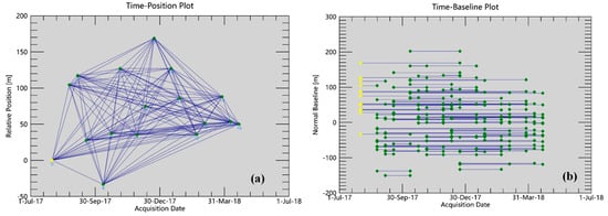 The multi-temporal SBAS-InSAR technique was employed to process 18 scenes of SAR image, with the image acquisition date of 31 July 2017 designated as the master image. The thresholds for spatial and temporal baseline were set as 200 m and 280 days according to the small baseline principle, respectively. Therefore, a total of 136 differential interference pairs were obtained. The connection diagrams for spatiotemporal baselines are shown in Figure 6. Subsequently, the Goldstein filtering method was used to suppress the effects of interferogram noise caused by atmospheric delays, etc., and the minimum-cost flow (MCF) method was employed to unwrap the differential interferograms. Finally, the time series deformation rate for the coal mining area was obtained by projecting the interferometric phase onto the LOS direction, which was then converted to the WGS84 coordinate system by the geocoding process. Therefore, the SBAS-InSAR-derived cumulative surface displacements for the mining goaf with high point density were finally achieved, as indicated in Figure 5.