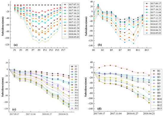 The spatially point-wise cumulative displacements derived by SBAS-InSAR in the strike direction and the dip direction of the working face, with time series displacements for (a,c) points P1~P17 and for (b,d) points B1~B13 near the Guotun coal mine working face.