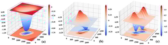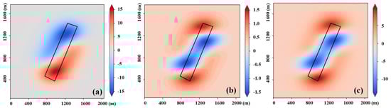 (a) Vertical displacement field (m), (b) horizontal displacement field (m), and (c) horizontal movement field (mm/m) derived by retrieved parameters and PIM principle for the mining area; the black rectangle denotes the working face.