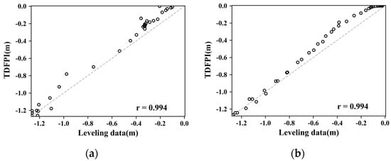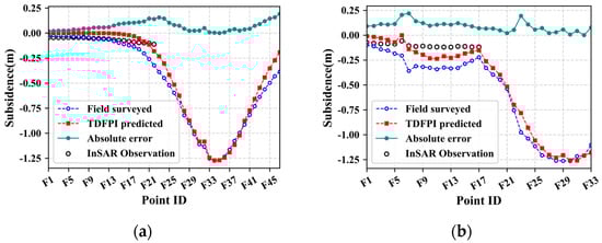 The scatter plots of the errors between TDFPI-predicted subsidence and field-surveyed measurements along the observation (a) line A and (b) line F, respectively.