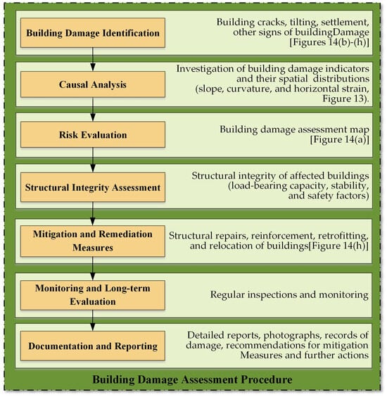 Building damage assessment is a critical process in the coal mining areas, which involves evaluating the structural integrity and potential risks faced by buildings due to mining activities. In order to further apply the proposed method and make it more applicable in this coal mining area, the key processes of building damage assessment are proposed in Figure 15 and discussed as follows.