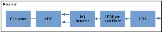 The receiver, depicted in Figure 3, includes an analog chain that is responsible for the demodulation and amplification of the received echoes. It starts with a low-noise amplifier (LNA), followed by a downconversion to a 400 MHz intermediate frequency (IF) and filtering (80 MHz of bandwidth). The local oscillator is provided by the same reference signal from the transmitter, guaranteeing a coherent conversion. The IQ detector converts the signal to a baseband and separates it into the I/Q components, which are then digitized at a maximum sample rate of 100 MS/s and stored in a computer for further processing. Table 2 summarizes all relevant parameters of the receiver chain.