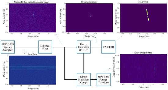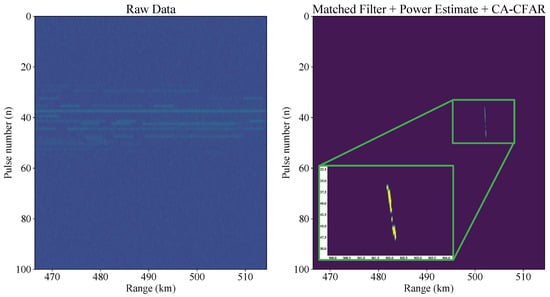 The first one computes the sample power and passes the signal through a cell-averaging constant false-alarm ratio (CA-CFAR) [] (Chapter 6) detector with a probability of false alarm of . At the end of this branch, a list of range detections is obtained. The second branch compensates for range migration and performs pulse-Doppler processing.