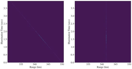 Real examples of the signal model in Equation (7) are presented in Figure 4 and Figure 5 ( is the range axis, and is the Illumination time axis). These figures correspond to the squared magnitude of the pulse-compressed echoes received during the observation of two satellites. In both cases, it is possible to see a distinct line that corresponds to range migration during the illumination time.