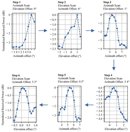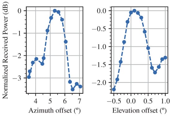 The basic principle of pointing calibration with the Sun consists of scanning the azimuth/elevation positions around the predicted position of the Sun and measuring the received power []. When the antenna is pointing to the center of the solar disk, it will receive the maximum power. The difference between the sensor angle readings at the peak power and the predicted position of the Sun corresponds to the bias in the positioning system.