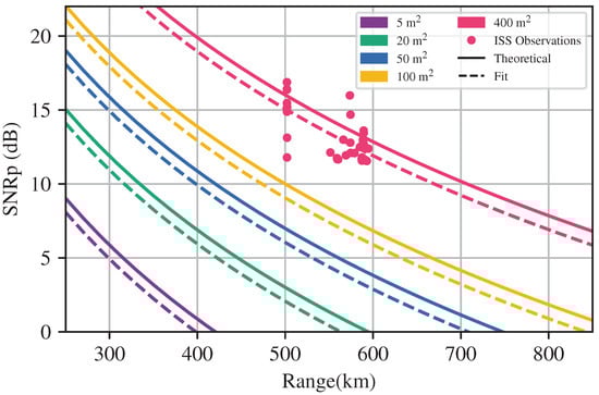 The loss term represents all the factors that are difficult to obtain/identify, e.g., system losses and atmospheric losses. While an educated guess can be a useful starting point to evaluate the future performance of a radar system, ideally, this term should be updated by performing measurements with the system. Figure 13 represents the theoretical curves obtained for ATLAS for different RCS values, represented as solid lines. Since we have now made observations of the ISS, we decided to use these to revisit the equation and improve it. To do this, we fixed the equation terms for an RCS of 400 m2 and fitted the loss term to the observations using a non-linear least-squares method. The fitting resulted in an of 15.94 dB with a variance of 6.09 dB. The fit curves are represented as dashed lines. The variance of the estimate is high due to the dispersion and number of measurements. We can see that for ranges around 500 km, the detections have variations of around 5 dB in the SNR, which can be due to many factors such as the scintillation of the object or variations in the gains of the system during pulse emission/reception. We are currently investigating the cause of these differences in the SNR for the same range and RCS. Currently, the number of observations is limited, and the objective is to gather more observations at different ranges and RCSs to obtain a better estimate of .