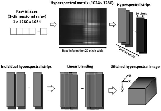 A processing workflow is created to generate the mosaic directly from the raw binary image file (Figure 3). In this workflow, each hyperspectral image is stored in a band interleaved by line (BIL) format, where the hyperspectral data of each band is stored along the columns of the hyperspectral matrix, with each hyperspectral matrix having a dimension of 1024 × 1280. Given 61 bands in total spread out along the columns of the hyperspectral matrix, each image band thus has a dimension of 1024 × 20 pixels. An image is then reconstructed by stitching the image band along the swaths (i.e., flight path) with an overlap ratio calculated from the UAV’s speed and frames-per-seconds (FPS) of the sensor as detailed in the equations in Equation (1) and Table 1. The procedure is repeated for all bands to obtain a hyperspectral cube.