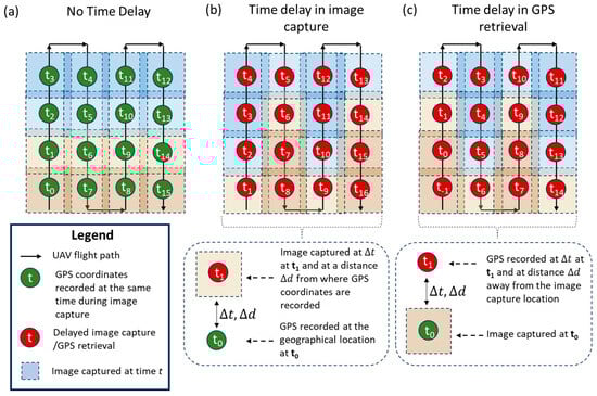 As mentioned previously, the images located between the pair of GPS coordinates were retrieved based on matching the images’ timestamps that fall within the timestamps of the pair of selected GPS coordinates. The retrieved images were used to produce the image mosaic for each swath. However, if there is any time delay between the GNSS system and the imaging system, there would be a mismatch in the timestamps of the image captured at the location and the corresponding GPS coordinates. The images that matched the misaligned time stamps of the GPS coordinates would result in the incorrect retrieval of the set of images (Figure 4) and result in a systematic offset in all mosaicked images.