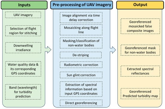 In light of this, this study aims to (1) establish a mosaicking workflow independent of distinctive features for push-broom imagery acquired over open seas, (2) propose an efficient method for correcting the image misalignment attributed to the time delay between the on-board GNSS and the imager, (3) evaluate the performance of each data processing step for a highly modular hyperspectral push-broom system, and (4) validate the applicability of the developed workflow developed in this study on the retrieval of coastal turbidity in the coastal region of Singapore. An open-source code with a graphical user interface, CoastalWQL (https://github.com/pakhuiying/CoastalWQL) (accessed on 13 February 2024), is also provided for end-to-end processing and analysis for public access.
