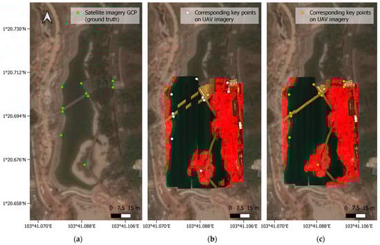 Common key distinctive features identified in Nanyang Lake, Singapore (a) high-resolution Google satellite imagery which serves as ground-truth (b) mosaicked UAV false composite image without time delay correction (c) mosaicked UAV false composition image with time delay correction.