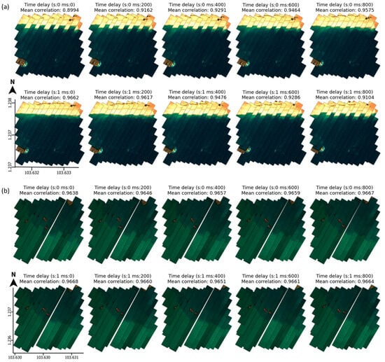 Figure 8 shows the effect of various time delay corrections (i.e., between the GPS timestamps and image timestamps) on the image alignment, where time delay may be a significant issue for highly modular camera systems with independent GPS and image acquisition modules. It can be observed that without any time delay correction, the systematic offset can be visibly observed in adjacent image lines in the first panels of Figure 8a,b. After applying the time delay correction, the imageries in Figure 8a,b showed the best alignment in the images after a time delay correction of 1 s, with an average spectral correlation of 0.9662 and 0.9668.