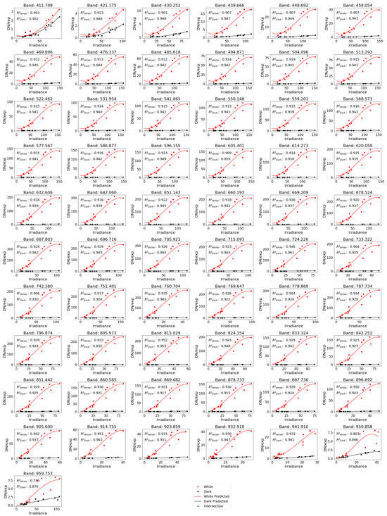 The third-order polynomial curve fitting for the white and dark reference demonstrated a strong relationship between the ratio of DN to exposure time and the measured irradiance for most of the wavelengths, with an R2 exceeding 0.94 for most wavelengths (Figure 9). However, it is observed that the signal-to-noise ratio for wavelengths smaller than 450 nm and larger than 940 nm is relatively low, where the calibration curves for the white and dark reference lie close to one another, especially at low irradiance values. This also implies that radiometric correction at these wavelengths under low illumination conditions would be highly limited and could result in numerical instability, as reflectance values for the white and dark reference are very similar.