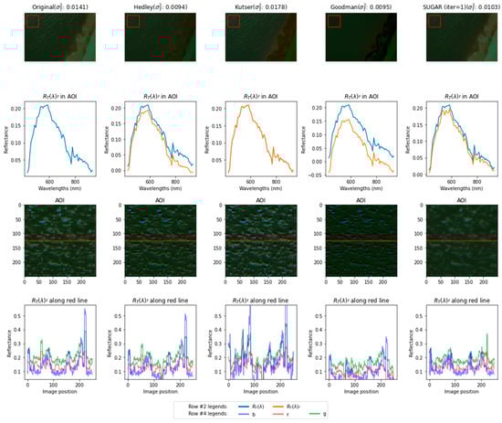 where represents taking the minimum value of a 5 × 5 neighbourhood at to obtain the background spectra. It can be observed from Equation (10) that the correction is only conducted on glint pixels, leaving non-glint pixels unaltered. This ensures that the sun glint correction is focused only on the sun glint pixels, and other features in the scene are kept unchanged, such as turbidity plume or shoreline.