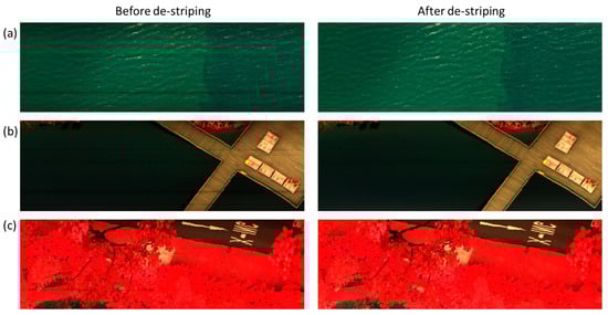 The goal of de-striping is to flatten the latitudinal DN profile of the calibrated white reference for each band as much as possible, with respect to its maximum DN, as it is assumed that the maximum DN is unaffected by stripe noises. A de-striping factor of was multiplied by each pixel in the mosaicked image for de-striping (Equation (11)). At the same time, this also provides an efficient method for correcting vignette effects at the edges of the image.