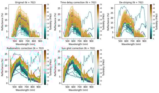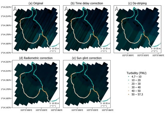 To assess the effectiveness of each pre-processing procedure, turbidity retrieval was conducted at each step according to the following sequence: (1) uncorrected reflectance (original), (2) time delay correction, (3) de-striping, (4) radiometric correction, and (5) sun glint correction. Masking of the vessels was applied prior to pre-processing for confidentiality purposes.