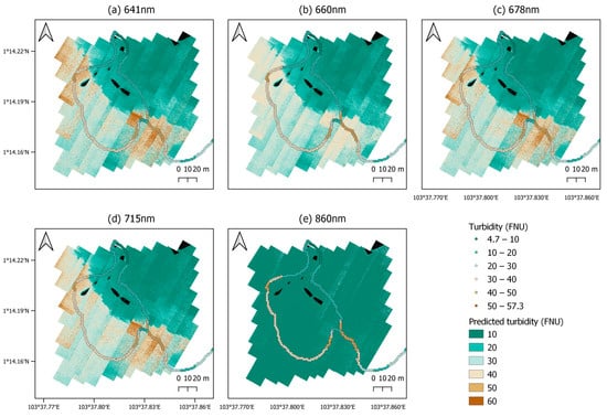 An analysis was conducted to determine the quantitative effect of these bands on turbidity retrieval. The closest bands in the hyperspectral sensor that matched these bands were 641 nm, 660 nm, 678 nm, 715 nm, and 860 nm, which ranged from the red to NIR wavelength.