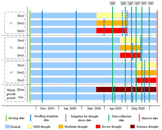 Experimental timeline for the 2019–2020 winter wheat planting period. The light green solid line represents the sowing date. The red solid line represents the harvest date; the blue solid line (guaranteeing emergence) and the blue dotted line (guaranteed drought level) represent the irrigation dates. The dark green solid line represents the data collection date. The light blue, yellow, orange, red, and wine red horizontal bars represent the winter wheat plots under normal, mild drought, moderate drought, severe drought, and extreme drought levels, respectively.