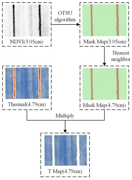 The co-registration method, i.e., the NDVI-OTSU method, was used to separate vegetation pixels from soil pixels for subsequent Tc extraction. This method had two main steps (Figure 4). First, the OTSU algorithm [56] was applied to the NDVI [57] to obtain the winter wheat canopy mask data. This was then resampled to match the thermal infrared images.