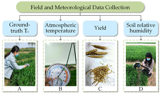 Schematic of ground data collection, including ground-truth Tc (A), atmospheric temperature (B), yield calculated (C), and soil relative humidity data (D).