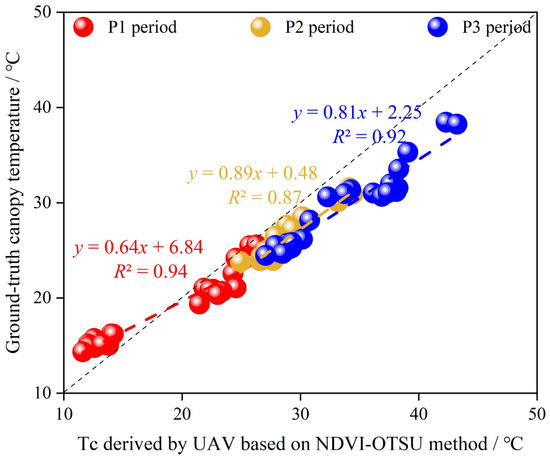 Figure 6 shows that there was a strong linear relationship between the Tc extracted from the UAV-based NDVI-OTSU method and the ground-truth Tc from the three growth periods. The UAV maintained a constant flight altitude.
