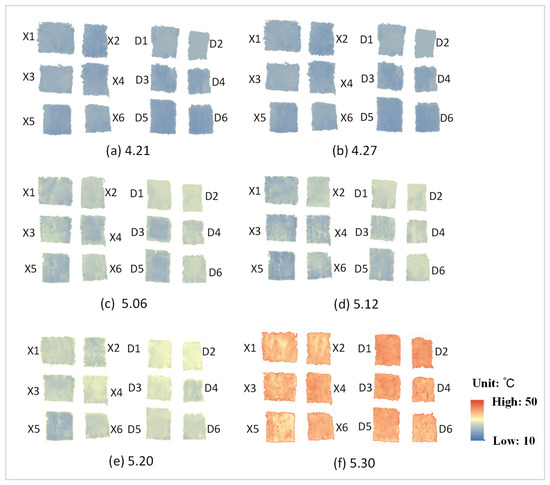 Figure 7 shows the Tc of winter wheat calibrated using UAV. Throughout the growth period, D1 and D2 consistently had the highest Tc, especially since the P2 period. X5 consistently had the lowest Tc. During the P1 period, X6, X1, and X3 showed higher Tc values after drought. Meanwhile, the Tc of the other non-drought-stressed plots did not differ significantly. After the rehydration of X6, X1, and X3 during the P2 period, the Tc of the plots gradually approached that of the normal plots. During the P3 period, the Tc of the X6, X1, and X3 plots approached that of X5. The Tc of the X2, D4, and D6 plots gradually approached that of the normal plots. The crown temperatures of the D5, X4, and D3 plots also gradually increased after drought.