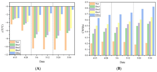 Statistical chart of the ∆T index (A) and the CWSIsi (B).