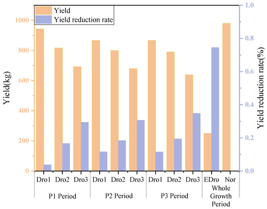 Figure 10 shows the calculated yield of winter wheat for each plot. For each growth period, drought-stressed plots caused a certain degree of yield reduction. Throughout the growth period, the highest yield at 979.39 kg/km2 was observed in the X5 plot. The lowest yield at 249.15 kg/km2 was observed in the D1 and D2 plots, resulting in a 74.56% yield reduction. During the P1 period, the X6 plot exhibited a relatively insignificant yield reduction of 3.73%. Meanwhile, the X1 and X3 plots exhibited yield reductions of 16.63% and 29.42%, respectively. During the P2 period, the X2, D4, and D6 plots exhibited yield reductions of 11.64%, 18.38%, and 30.65%, respectively. During the P3 period, the D5, X4, and D3 plots had yield reductions of 11.54%, 19.40%, and 34.84%, respectively. The degree of yield reduction increased with drought severity during each growth period.