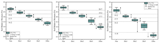 Figure 11 shows the soil’s relative humidity. During the experiment, four small and uniform irrigations were performed to maintain the drought level of the plot. The soil relative humidity at different drought levels in different growth periods remained within the experimental design range.