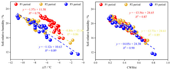 This study only used UAV thermal images to extract Tc and construct the ∆T and CWSIsi indicators. Soil relative humidity was used to evaluate the performance of winter wheat drought monitoring at different levels (Figure 12). Under drought, both ∆T and CWSIsi increased and were significantly negatively correlated with soil relative humidity. For the ∆T index, the correlation is highest in the P3 period, with an R2 of 0.89. The R2 of P2 period is 0.86. The R2 value during the P1 period was 0.78, and it is speculated that this may have been due to the influence of the initial soil moisture conditions in the control plots. For the CWSIsi, the correlation was highest in the P3 period, with an R2 of 0.90. In the P2 and P1 periods, the R2 values were 0.89 and 0.87, respectively. Overall, ∆T and CWSIsi were both highly correlated with soil relative humidity, while the correlation between CWSIsi and soil relative humidity was more stable.