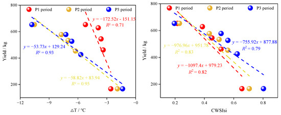 Based on the relationship between two temperature indicators and yield (Figure 13), the threshold for differentiating winter wheat drought disasters was calibrated. When the winter wheat yield decreased by more than 30%, i.e., when the yield was less than 685.58 kg/km2, it was considered a drought disaster. The threshold values for identifying drought using the ∆T index during the P2 and P3 periods were −6.38 °C, and −6.14 °C, respectively. The threshold values for identifying drought using the CWSIsi during the P1, P2, and P3 periods were 0.49, 0.52, and 0.57, respectively. Given the limited experimental data and small sample size, further research is needed to verify the accuracy of this threshold.