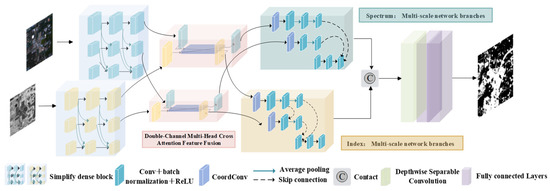 In remote sensing image analysis, multispectral data in different bands contain rich information. It can provide reflectance information of different surface bands, thereby providing strong support for research on vegetation cover, land use, and environmental changes, among other aspects. However, the information contained in the different bands of multispectral data is complex, and the complementarity between these pieces of information can be better utilized through certain information fusion strategies. Therefore, we designed a dual-path multihead cross-attention feature fusion module to enhance the interaction between multispectral data and vegetation indices, improving the accuracy and effectiveness of vegetation identification in remote sensing images, as shown in Figure 3.