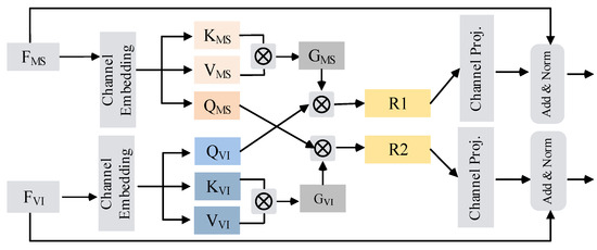 Changing the computation order of query Q, key K, and value V can significantly reduce the computational complexity. Inspired by this, in this module, input features F (H, W, C) were flattened to F (N, C). Then, linear embedding was used to generate Q, K, and V for each attention head. Each head computed attention scores G (MS) and G (VI) for KV, which were derived from multispectral branches and vegetation index branches, respectively. After softmax normalization, the attention scores GVI from vegetation index features were cross-multiplied with spectral features QMS, forcing the vegetation index branch to focus attention on spectral features. Similarly, attention scores GMS from spectral features were cross-multiplied with vegetation index features QVI, forcing the spectral feature branch to focus attention on vegetation index features. Branches in the two sequences interacted complementarily, thus achieving feature fusion. This can be expressed as follows: