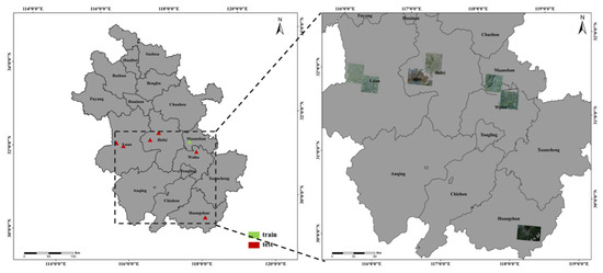 Anhui Province covers a total area of 140,100 square kilometers, with a permanent population of 61.27 million people. Anhui Province is located between east longitude 114°54′ to 119°37′ and north latitude 29°41′ to 34°38′, as shown on the map. Anhui Province is situated in a transitional zone from a warm temperate to subtropical region. It includes 16 prefecture-level cities, and its main geographical features are plains, hills, and mountains. The annual average temperature is 17.1 degrees Celsius, with an average annual precipitation of 978 millimeters. Different climates and social factors may lead to variations in vegetation cover across different regions of Anhui Province. In this study, six random regions were selected for validation in the vegetation-rich areas of central and southern Anhui Province, as shown in Figure 4. The selected area includes different types of vegetation in urban areas, mountainous areas, and rural areas.