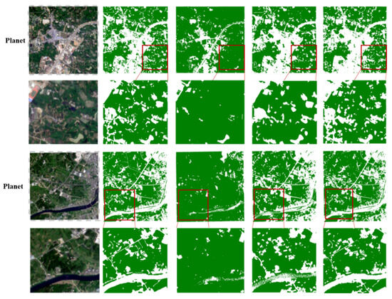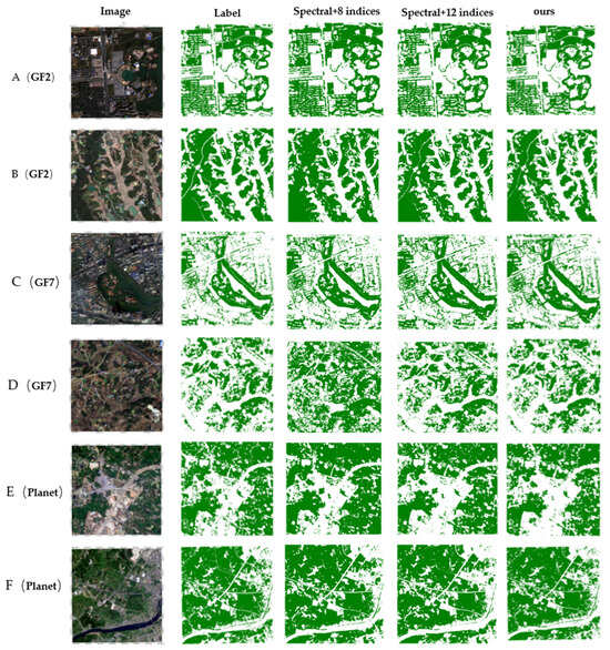 In this study, six regions were randomly selected from GF2, GF7, and planet images for model effectiveness evaluation. These six regions (A–F) were widely distributed in different spatial locations, collected from different images, and have relatively complex backgrounds. The quantitative results for the three data sources are listed in Table 4. Figure 6 displays the qualitative results for various scenes from these three data sources. In Figure 6, green represents vegetation areas.