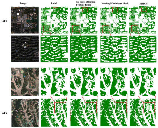 By randomly selecting six areas within the study area, the qualitative and quantitative evaluation results of MSICN in these six areas are shown in Figure 5 and Table 3. The results of vegetation extraction in the GF2 image area indicate that our proposed method performs well in densely populated and complex urban areas. In particular, the extraction of boundaries between roads, buildings, shadows, and vegetation coexistence areas is relatively clear and, overall, intact.
