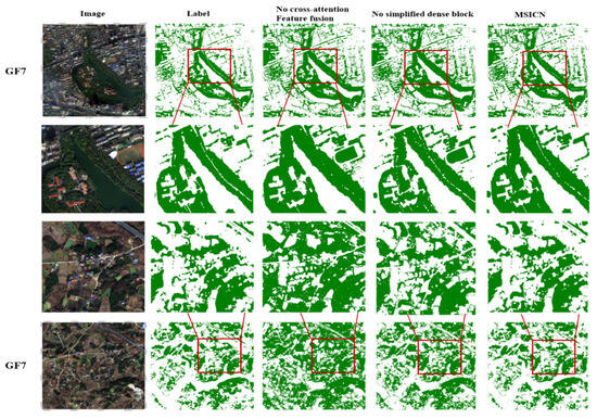 Results of the third group of ablation experiments in the gf7 imaging area. Green represents vegetation. The red box represents a zoomed in detail image of the local area.